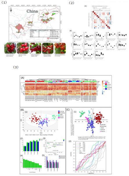 图(1)中国樱桃原产地分布及品种;(2)樱桃稳定同位素及元素特征与产地环境相关性分析,及区域差异;(3)HCA、PLS-DA和LDA建模判别结果