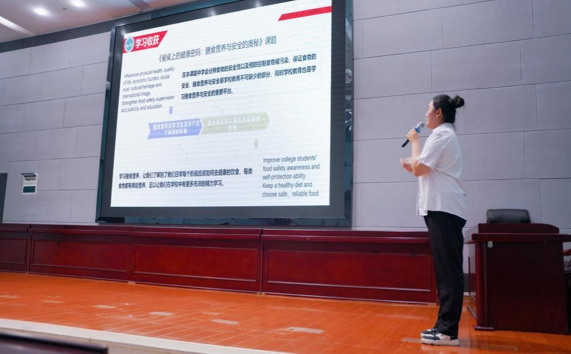 会议开始,国际交流处(港澳台事务办公室)处长黄敏致辞,她详细介绍了该项目的基本情况,并引用习近平总书记在二十大报告中的关键词,突出了党和国家对推进高水平对外开放及国际化人才培养的重视,希望同学们能够强化理论知识,积极参加实践活动,努力向具有国际视野的应用型复合型人才靠拢。汤映景同学作为第一批拿到由教育部中外文化交流中心颁发的结业证书的往届学员代表在会上发言,用她的故事激励每一位在场的同学。随后,50名学生分成5个项目组依次上台,通过PPT展示、现场讲解、互动问答等多种形式,展示了他们在可持续发展、国际关系、跨文化艺术、音乐康复治疗和膳食营养与安全等领域的创新实践成果。最后,国际班指导教师蒋成做总结发言,肯定了国际班一年来取得的成绩,也指出了目前存在的不足之处,同时为同学们今后的学习提供了新的努力方向。