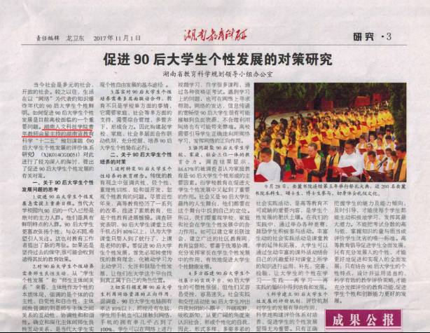 2017年11月,由RAYBET官网余星老师主持完成的湖南省教育科学“十二五”规划课题《90后大学生个性发展的评价体系研究》(XJK014CGD051)研究成果被湖南省教育科学规划领导办公室作为成果公报推广,并被《湖南教育科研》报道。据悉,余老师的课题研究论文此前被评为湖南省教育科研协会优秀论文一等奖,还被省教育科学院邀请到颁奖大会上作成果汇报。