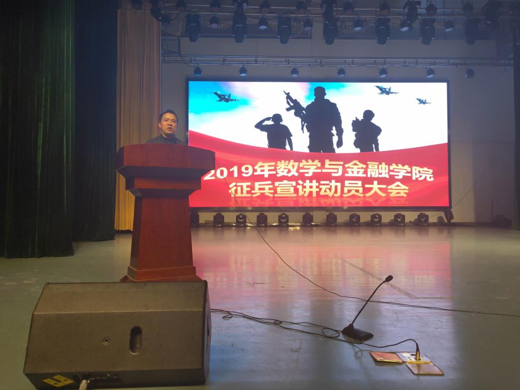 “绿色的军营,威武的军姿、整齐的步伐;铁甲铿锵,深海利剑,战机呼啸,核指苍穹……”,同学们被视频中震撼的画面深深吸引。4月17日晚,数学与金融学院在逸夫楼音乐厅召开2019年征兵宣讲大会。学校武装部部长郑秀星、学院党总支书记阳立新、党总支副书记刘晔、武装部招兵专干周樑、全院辅导员、班主任和近六百名学生参加了会议,大会在观看“参军报国,荣耀青春”宣讲视频中拉开序幕。